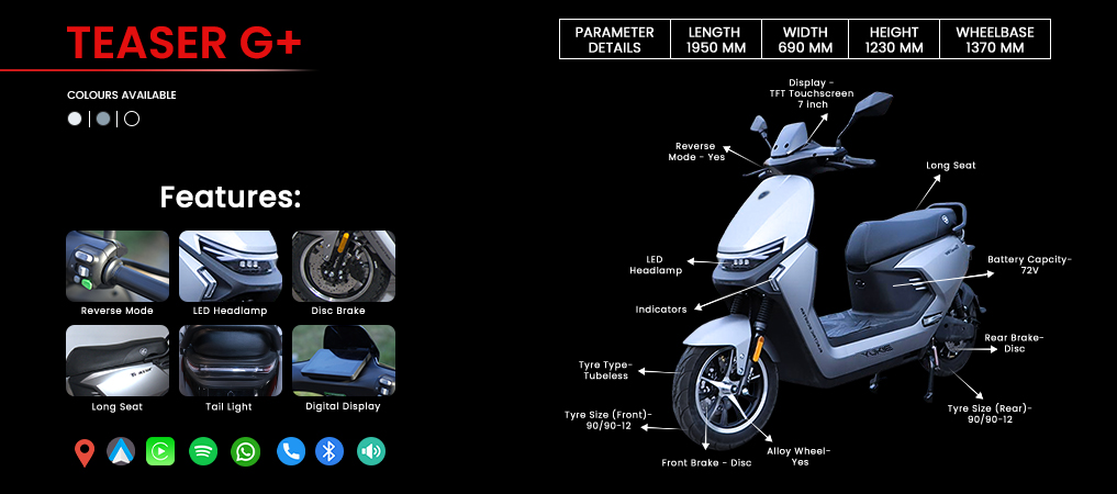 Meet the Yukie Teaser G+, the e-scooter that does more than just move you; it connects, comforts, and commands attention. With a 7-inch TFT touchscreen, Apple CarPlay, Android Auto, built-in speakers and navigation, it’s like your phone and your playlist got wheels. Twin disc brakes and telescopic suspension make every ride smooth and steady, even when the city isn’t. It charges in 8 to 10 hours, so you’re ready by morning. And yeah, it’s got reverse mode too, because sometimes life needs a little rewind.