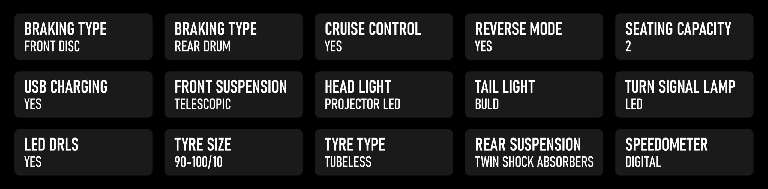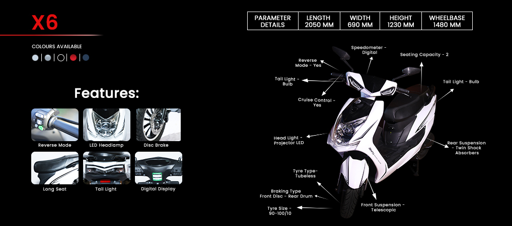 The Yukie X6 blends smart features with everyday comfort. It’s got a projector LED headlamp, cruise control, reverse mode and a digital speedometer for a smooth, confident ride. With tubeless tyres, solid suspension and space for two, it’s made for city life in bold colours and quiet style.